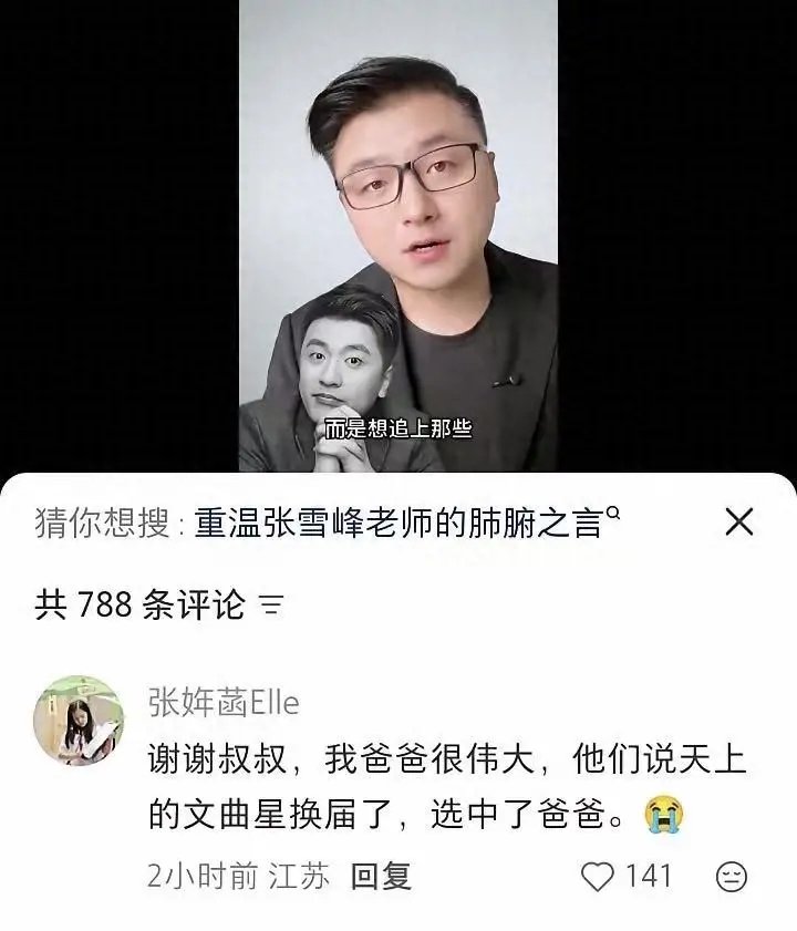 张雪峰的好友沈南发了一条吊问视频,放了一些两东说念主的合照,口吻尽是不舍。辩驳区里,张姩菡偷偷留了言,莫得大哭大闹,也莫得说太多话,仅仅轻声回了一句:谢谢叔叔,我爸爸很伟大,他们说天上的文曲星换届了,选中了爸爸。