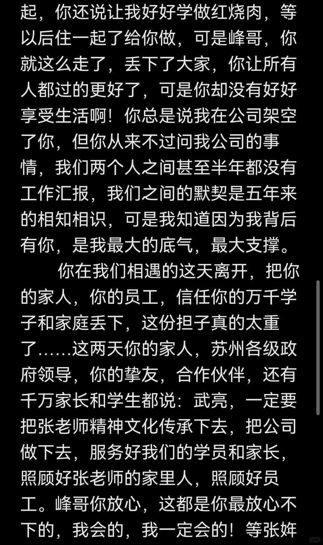 就在全球怨气冲天的时候,悲悼会收尾第二天,公司总司理武亮先站了出来,发了一篇长文,把公司的事说得清了了楚。可全球最想听的,如故李丽婧的话。