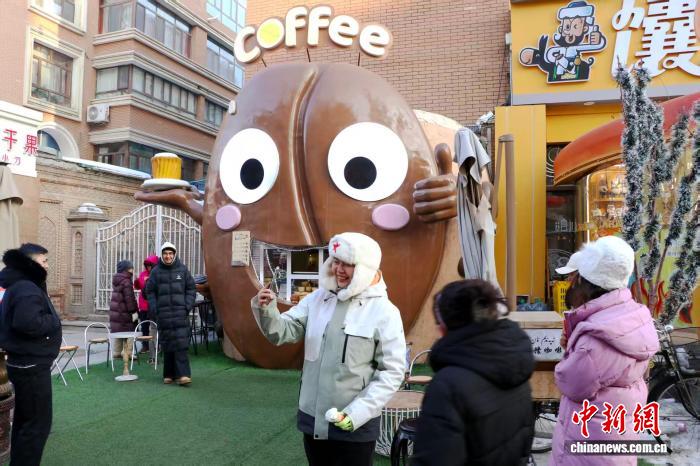 1月12日,在位于乌鲁木齐市的新疆国际大巴扎内,游客在“馕咖啡”摊位前拍照打卡。 苟继鹏 摄