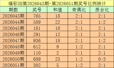 开奖归来:福彩3D第2026051期:奖号为302,奖号质合比为2:1,大小比为0:3,跨度为3,类型为组六。