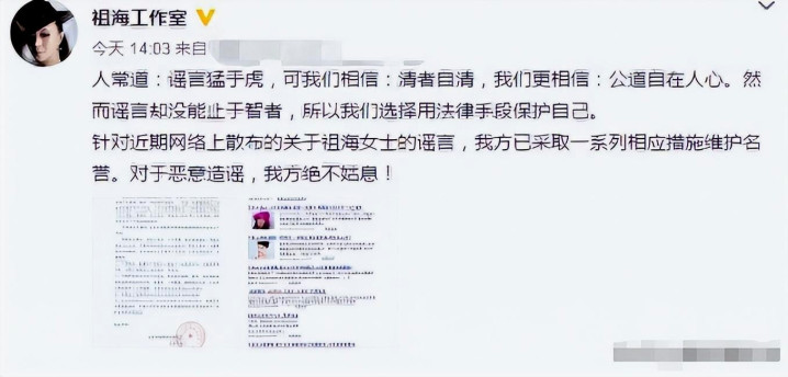 直到2023年深受困扰多年的祖海看着媒体一次次的拿自己炒作,再也忍受不了,让团队发出了律师声明,表示从开始到现在一直都忙于工作,到至今都是未婚单身。