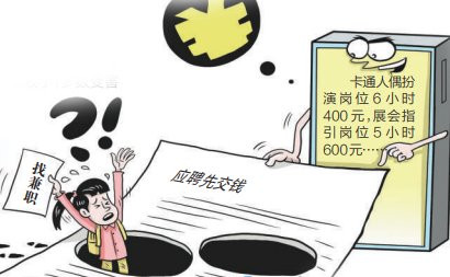 按照被骗应聘者的指引,记者洽商到一家兼职中介。对方暗示正在招聘的兼职包括卡通东谈主偶上演岗亭6小时400元,展会指引岗亭5小时600元,但齐需要口试,况兼必须是熟东谈主先容的才接待。