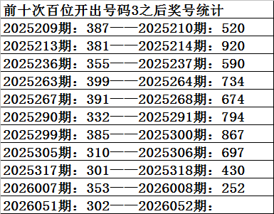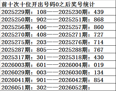 一、上期开奖:福利彩票3D第2026051期奖号为302。奇偶比为1:2,大小比为:0:3,奖号和值为5,奖号跨度为3。