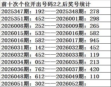 四、个位分析:上期开出号码2,前10次号码2出现之后下期同位号码为:8852529300,其中号码大小比为5:5,止境;奇偶比为4:6,基本捏平;012路比为4:0:6,2路号码发达较热。本期参考号码:2。