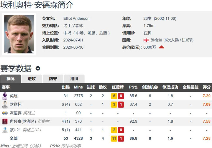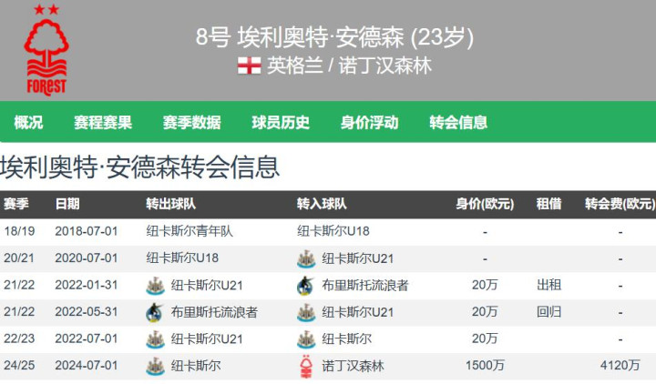 安德森出自纽卡斯尔青训,球员于2024年夏窗以4120万欧元的转会费从纽卡斯尔转投诺丁汉丛林,就此走上英超户口本球星之路,凭借着在英超的出色阐扬,仍是激励了英超多支Big6球队的口头。