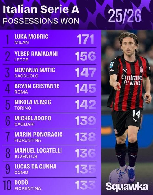 看重端,莫德里奇的场均跑动距离在10公里以上,跑动热图掩盖全场;联赛累计171次夺回球权,位列意甲首位;完成38次阻挠,排行队内第1、总榜第7;抢断46次位排队内第3。正如拉基蒂奇对他的评价:“淌若需要,莫德里奇以致不错成为加图索,因为他专注于团队。”