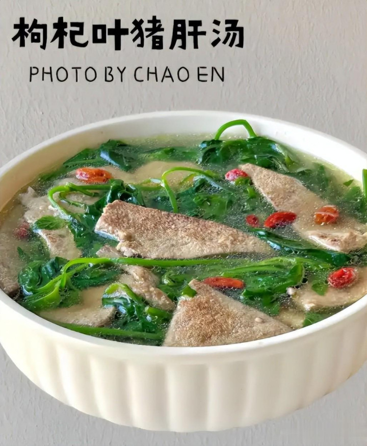 所需食材:枸杞叶200克、猪肝150克、生姜3片、枸杞10克、料酒适量、盐适量、淀粉适量、香油一丝。