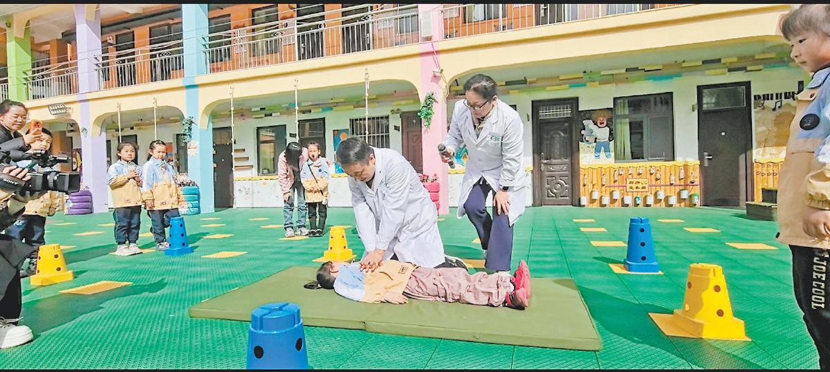近日,榆林市第十幼儿园纠合新明楼社区卫生工作中心,共同开展了一场寓教于乐的防溺水安全宣传行为。这是医护东谈主员指导孩子们开展溺水抢救状态模拟演练。