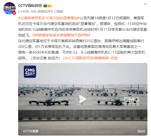 发布日期:2026-01-21 17:29 点击次数:182以色列第14频道1月12日报道称,美国军机近日在卡塔尔乌代德空军基地的活动“显著增加”。报道称,包括KC-135R空中加油机和B-52战略轰炸机在内的多架美军机当地时间1月11日夜间曾从乌代德空军基地起飞。