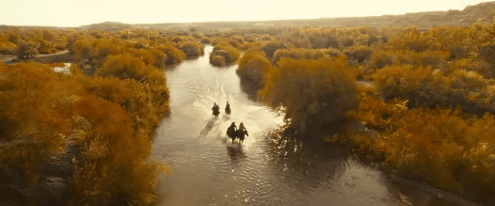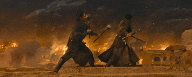 黄沙漫卷、夜色深千里、白纯洁净、猛火熊熊,每一处配景王人像一幅尽心勾画的画卷,尤其是片尾一群东说念主踏马奔赴长安的镜头,山峦叠嶂间,马蹄跃过潺潺溪水,溅起的水花与层林尽染的五彩交汇,既有江湖神志的强大,又有东方境界的摇荡,将登第武侠的轻易与豪壮展现得大书特书。