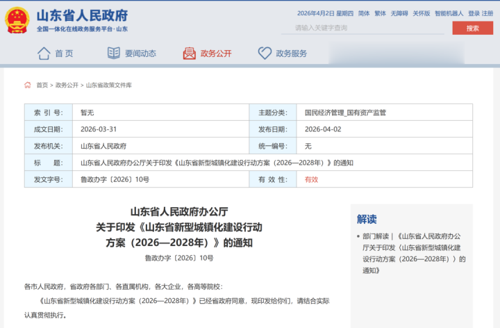 4月2日,山东省政府网站发布《山东省新式城镇化征战当作决策(2026—2028年)》(以下简称《当作决策》)。
